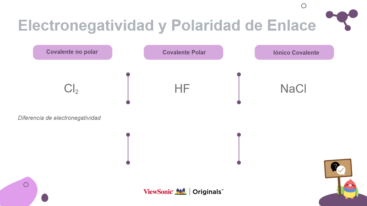 • Muestre la relación de la electronegatividad con el enlace covalente no polar, covalente polar e iónico.