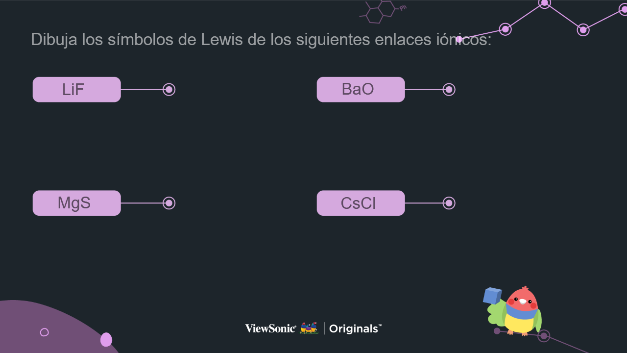 • Los alumnos pueden dibujar el símbolo de Lewis de cada elemento para comprender cómo se enlazan iónicamente en cada molécula.