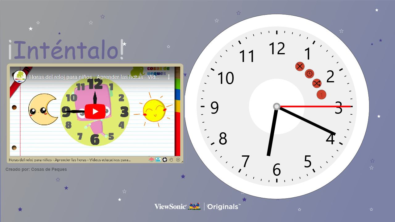Mueve las manecillas del reloj para emparejar la hora mostrada en el video.