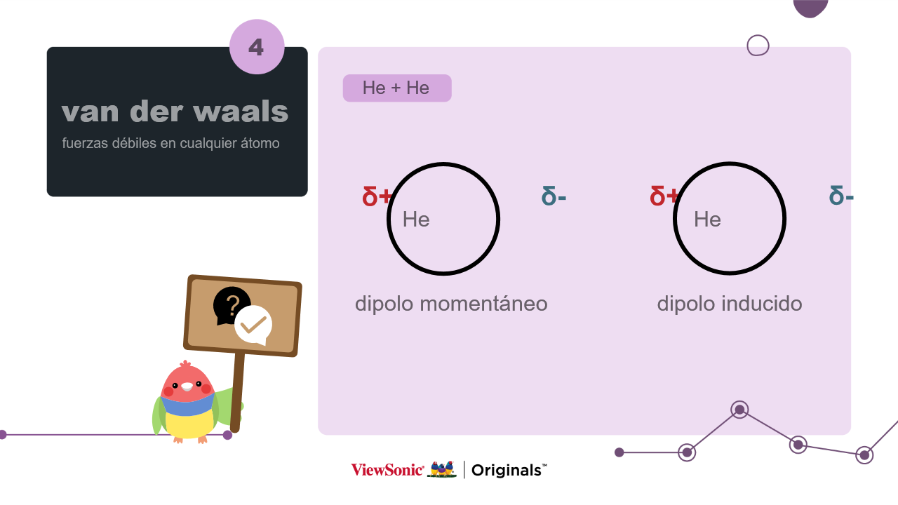 - Utiliza un ejemplo de interacción de Van der Waals para explicar el dipolo momentáneo, el dipolo inducido y el concepto de Van der Waals.
