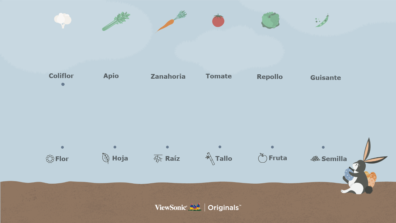 - Empareja la parte de la planta que comemos (flor, tallo, raíz, hoja, fruto, semilla) con las frutas y verduras utilizando gráficos animados de enseñanza y aprendizaje asistido.