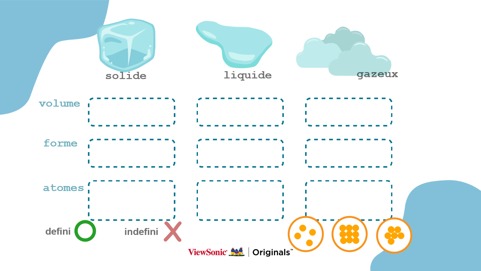 - Faire correspondre les définitions des solides, des liquides et des gaz en termes de volume, de forme et d'atomes.