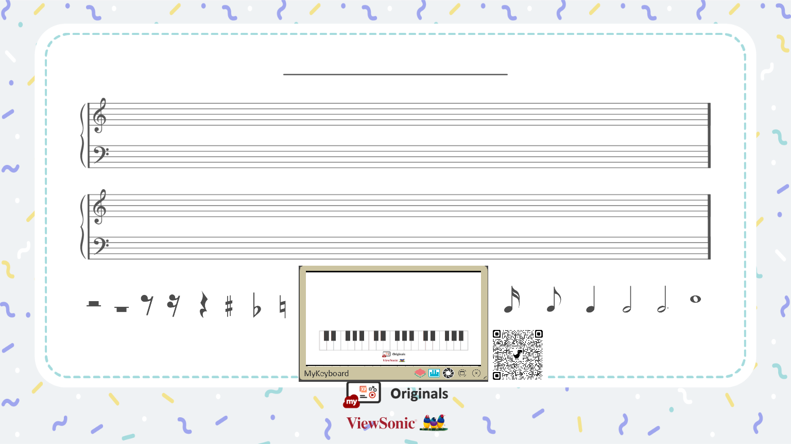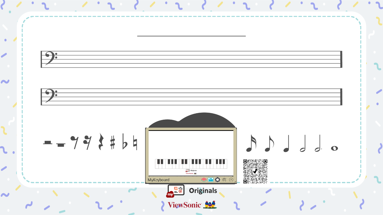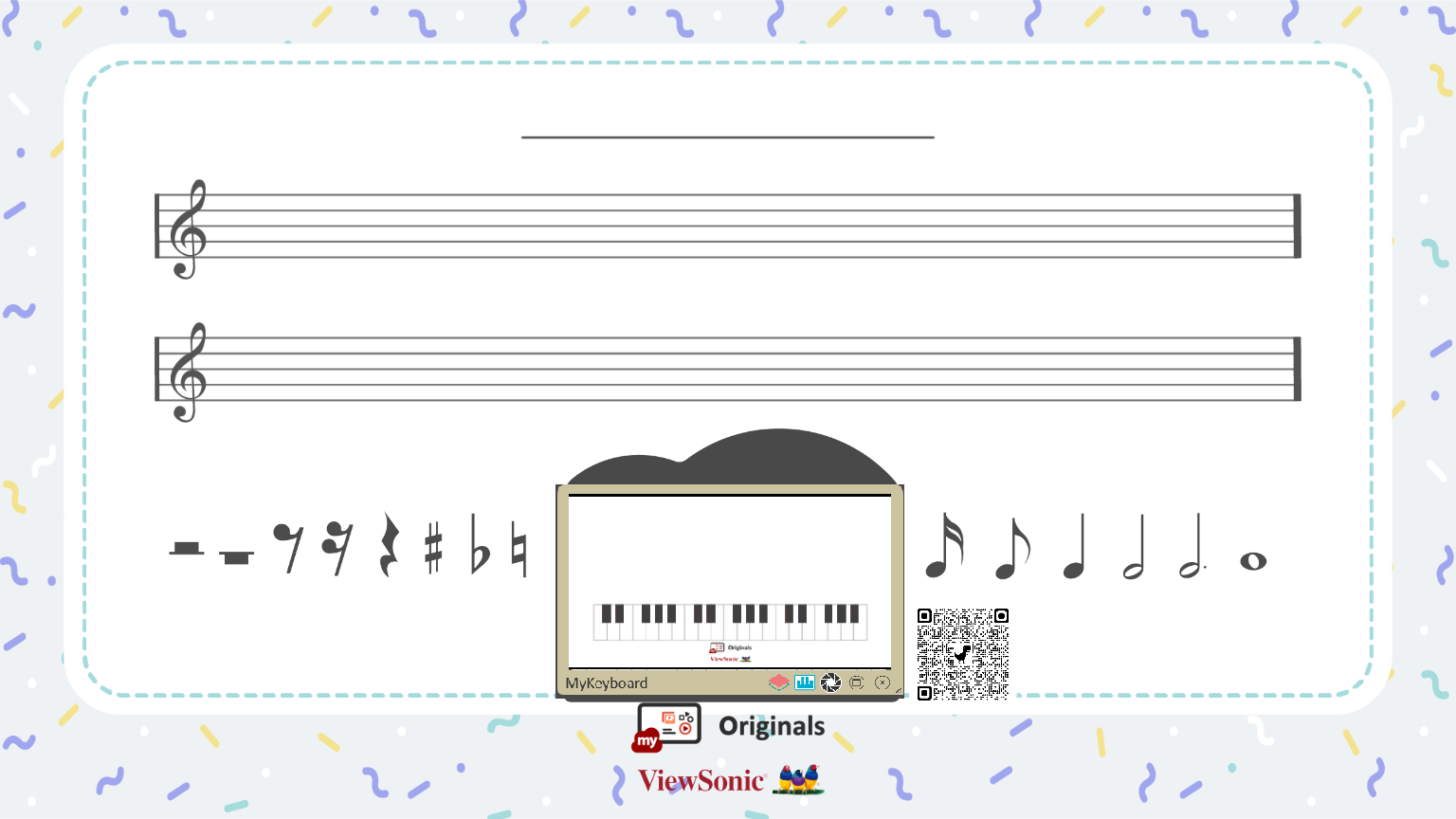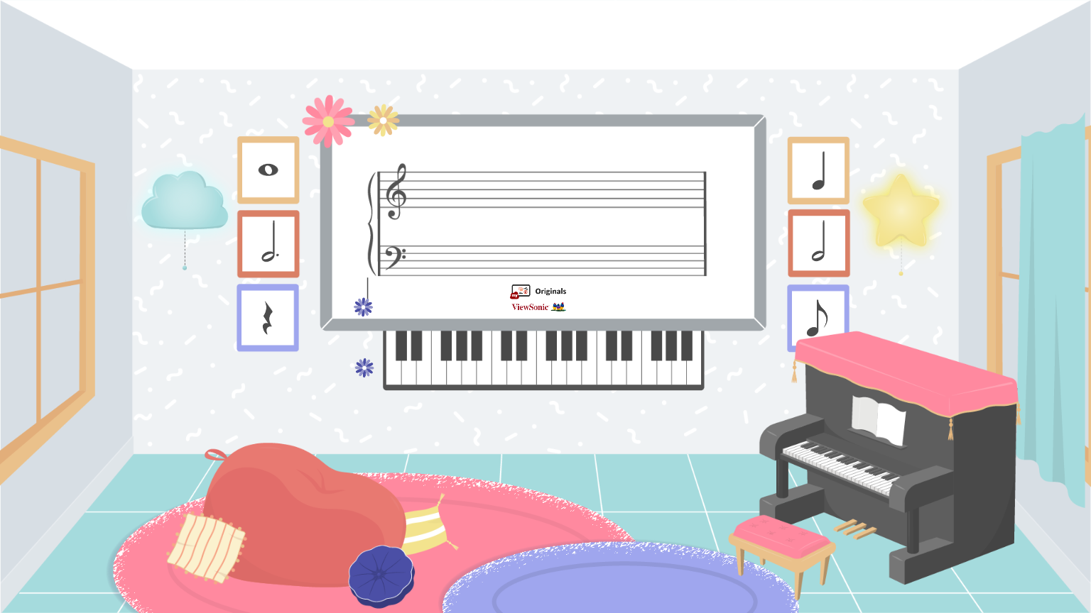 - Glissez-déposez chaque symbole musical (Originals Graphics) sur le côté droit et jouez sur le clavier du piano en ligne Originals pour reconnaître le son des notes de musique.