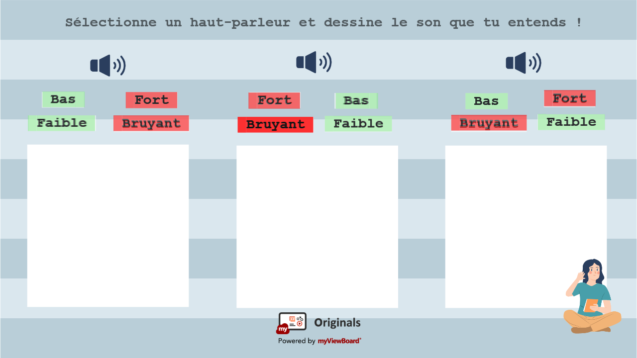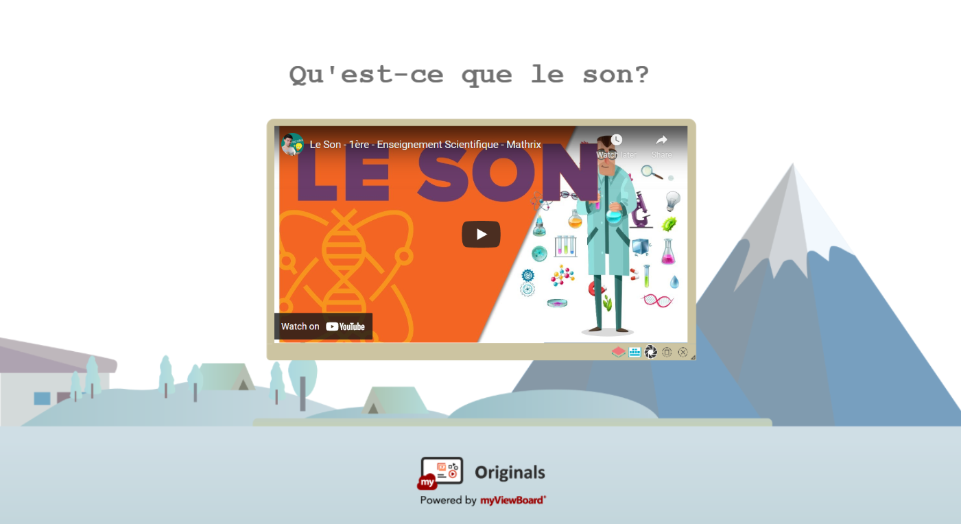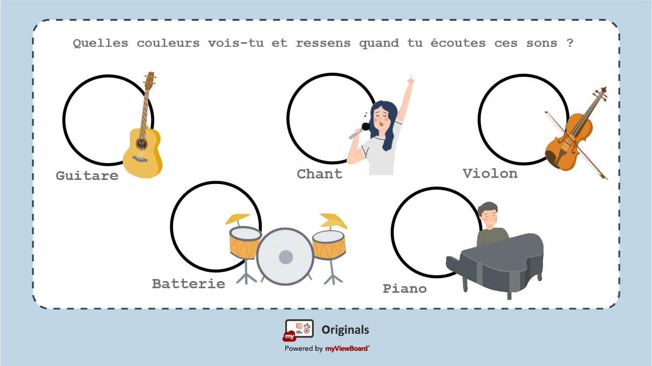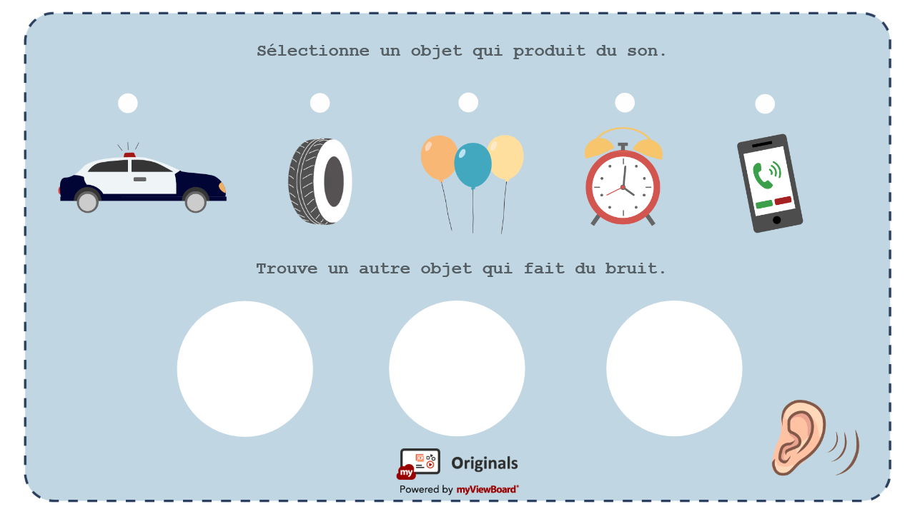- Qu'est-ce qui produit du son ? Quels sont les autres exemples d'objets qui produisent du son dans la vie de tous les jours ? Les élèves peuvent utiliser la fonction myViewBoard Partager pour participer et envoyer leurs réponses en classe ou à distance.