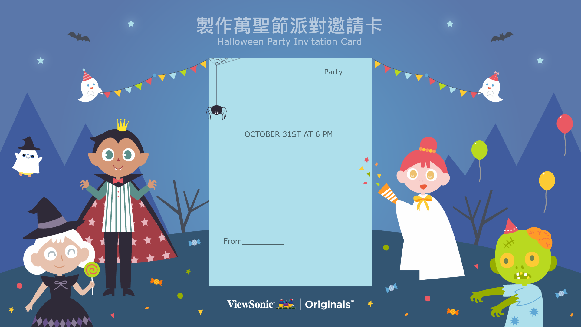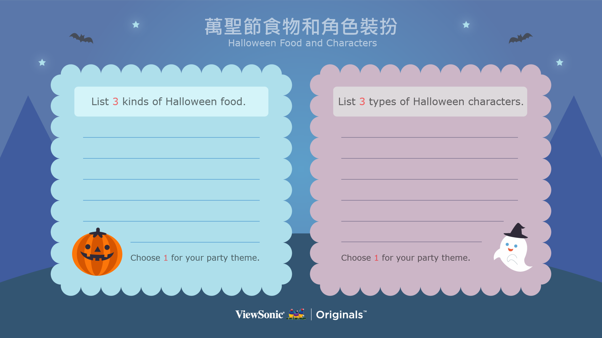 讓學生認識萬聖節活動,引導學生選擇食物與扮裝主題,並完成萬聖節派對邀請卡。