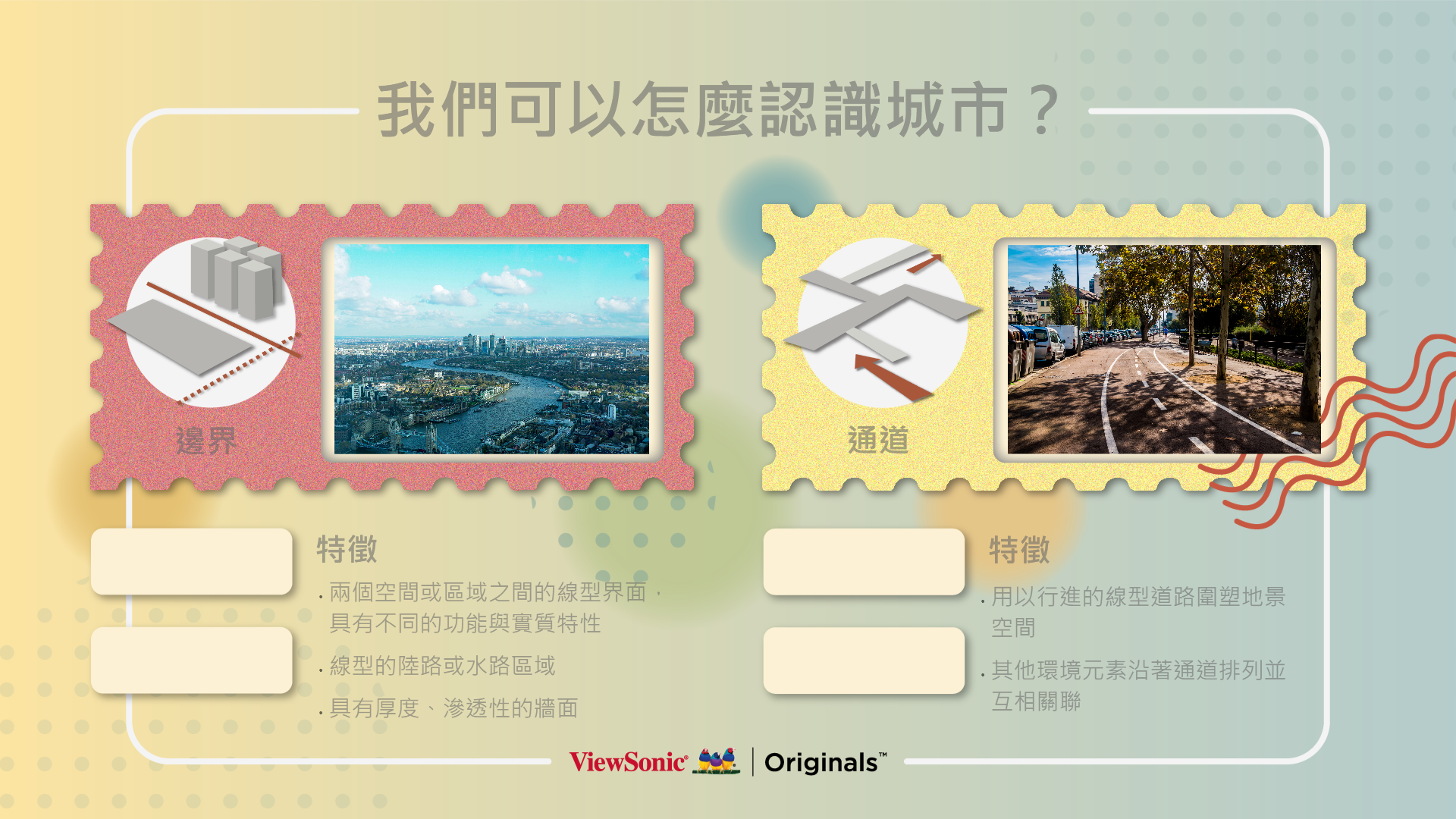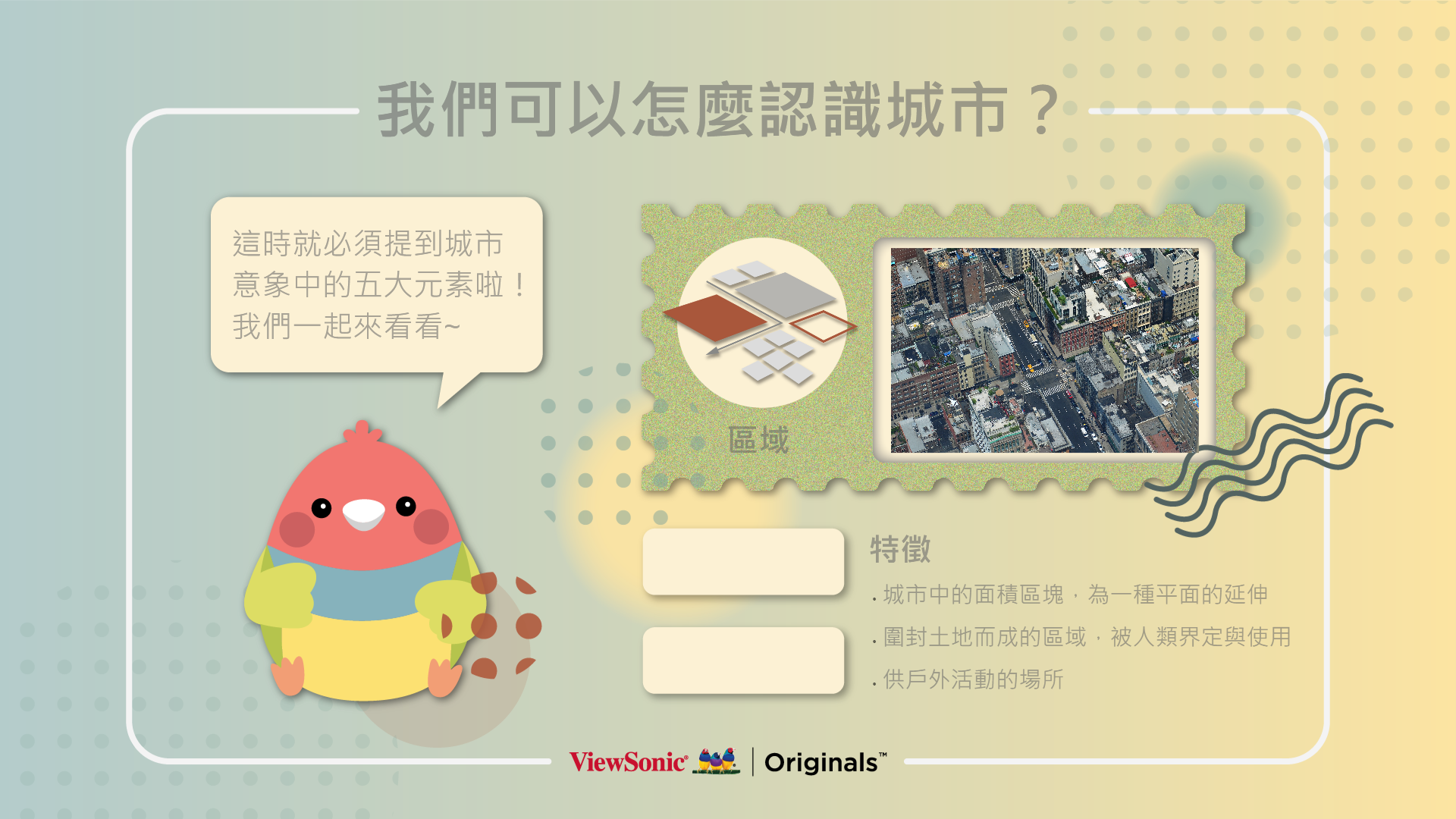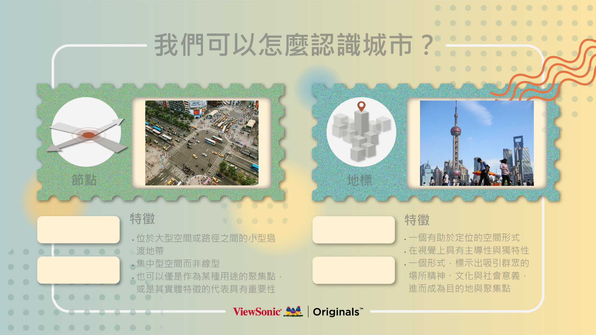 2. 介紹城市的五大元素:透過示意圖表與文字,搭配實際圖片的介紹,建立城市元素的基本概念。