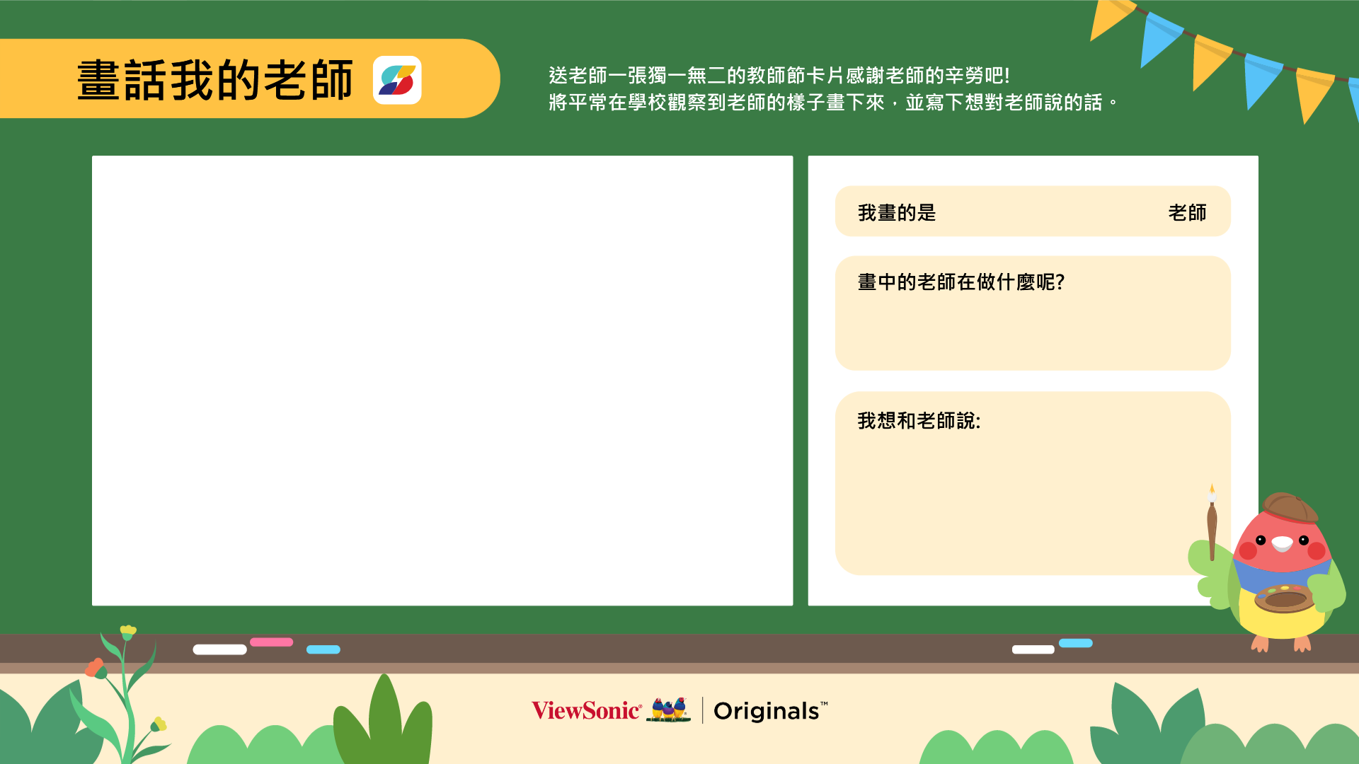 你所觀察到的老師的工作有哪些呢?畫下他們的身影,並寫上一句真誠的話語,送老師一張獨一無二的教師日卡片感謝老師的辛勞吧!