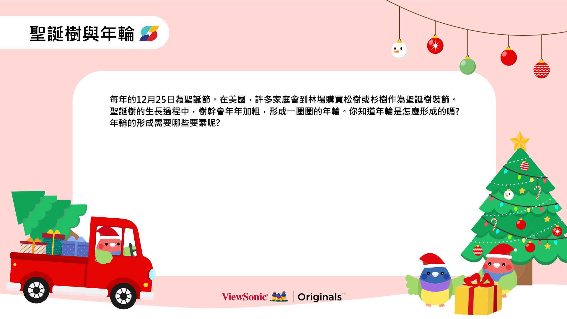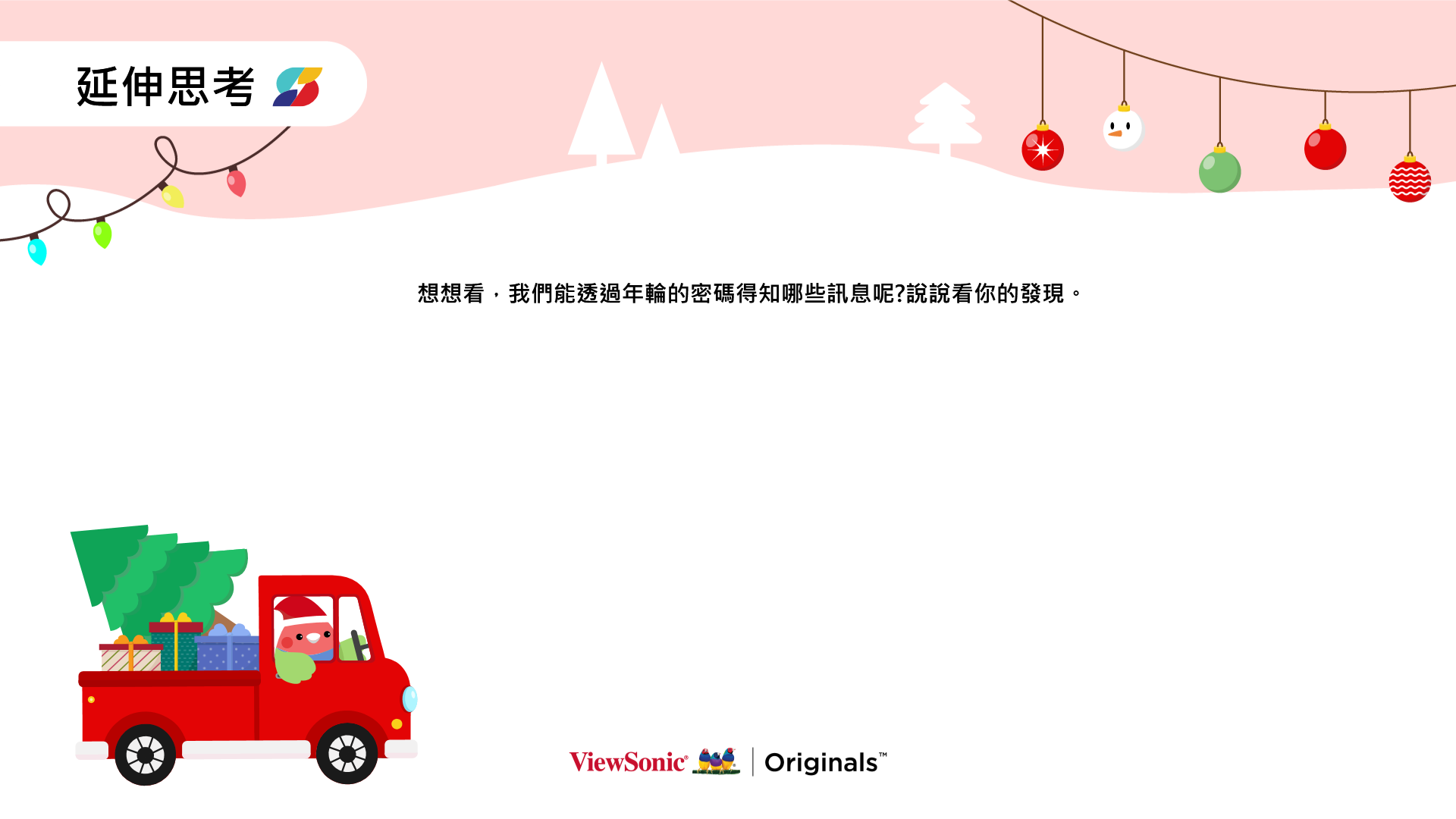 - 聖誕樹與年輪:透過美國聖誕節的傳統,認識聖誕樹年輪的形成。 運用ClassSwift即時派送數位白板畫面讓學生回答問題並進行討論。
