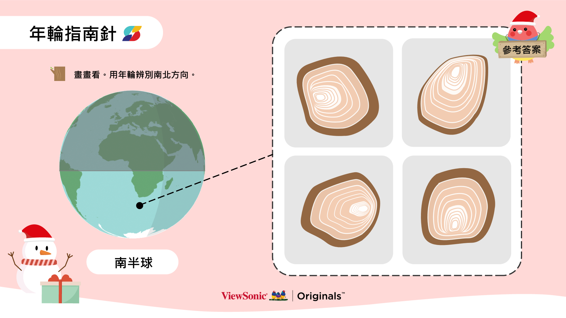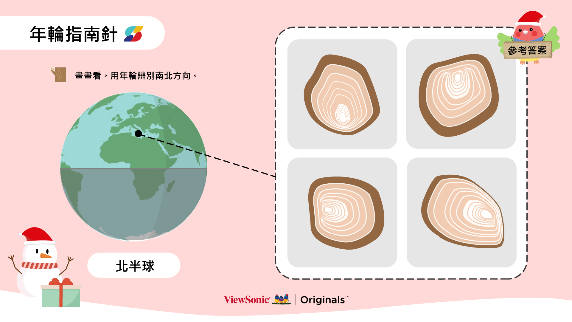 - 年輪指南針: 根據年輪提供的線索,找到正確的方向。寫下圖片中的年輪對應的南北方向。搭配ClassSwift即時派送數位白板畫面讓學生回答問題並進行討論。