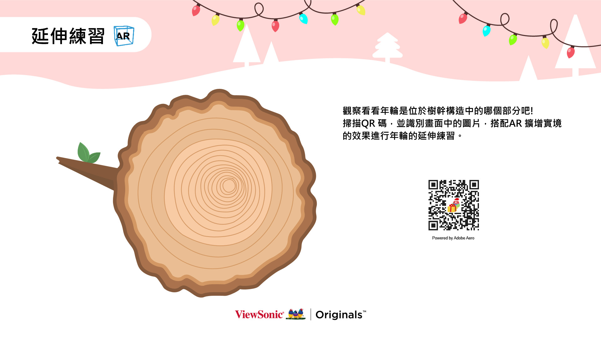 藉由美國聖誕節的傳統引起動機,透過聖誕樹讓學生了解形成年輪所需要的條件,以剖面圖認識樹木的構造,並搭配AR擴增實境的效果進行年輪的延伸練習。