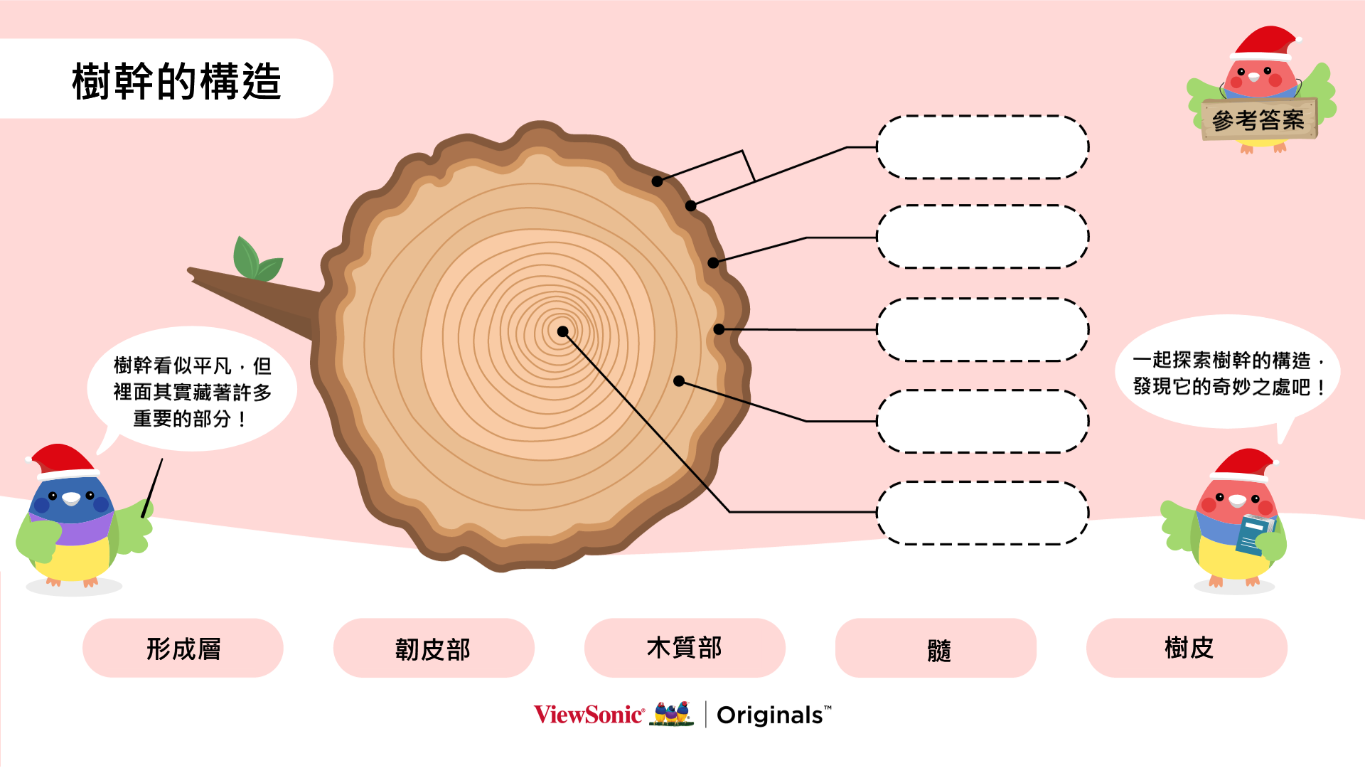 - 樹幹的構造:認識樹幹的構造。運用選取工具移動物件,將樹幹的構造名稱移動到正確的位置。