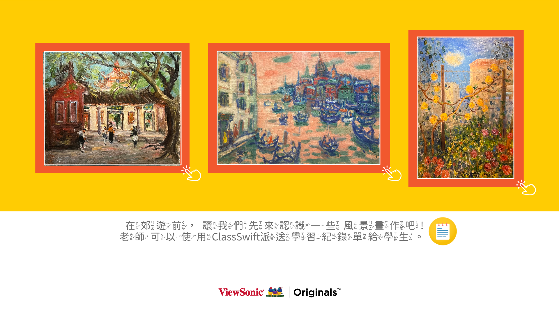 以三位台灣知名藝術家:陳澄波、廖繼春、楊三郎的風景畫作,運用ClassSwift + myViewBoard 帶領孩子們展開一場有趣的互動之旅,感受到藝術家在面對風景時的獨特視角,引導孩子們紀錄他們認為有趣的部分, 並將手作與自然風景做結合,創作出屬於自己的風景。