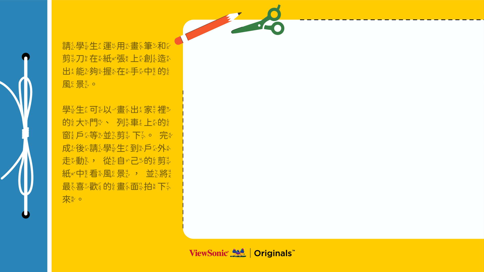 - 剪下你的風景框:請學生利用畫筆和剪刀在紙上創造手掌大小的風景,可以是家門或列車窗等等,完成後到校園中走動,用自己的剪紙觀察風景,拍下最喜歡的畫面。