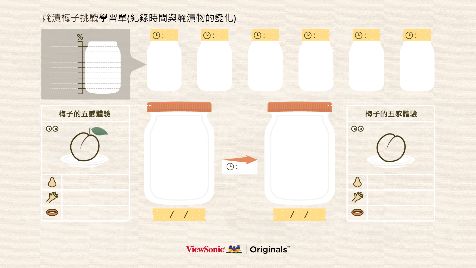 - 醃漬物挑戰學習單:紀錄時間與醃漬物的變化,並透過五感體驗觀察醃漬