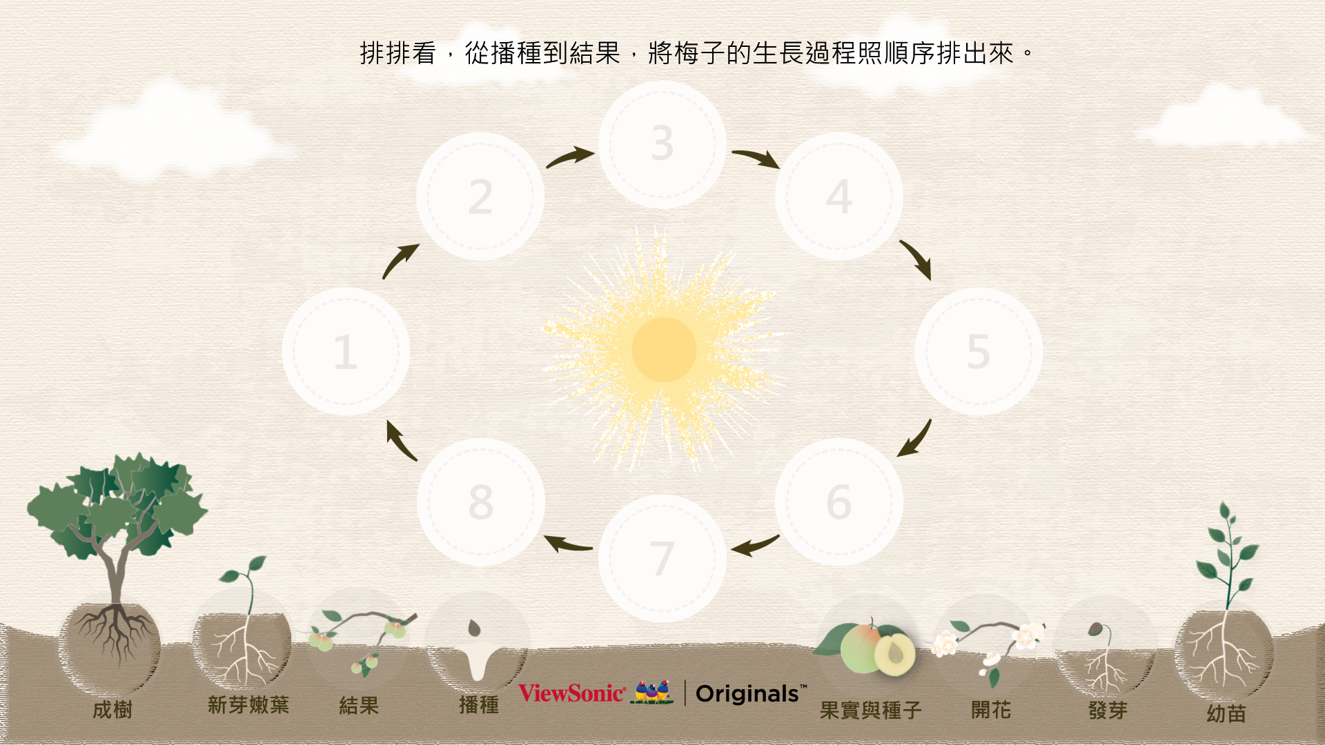 - 排列練習:依照梅子的生長過程照順序進行排列。