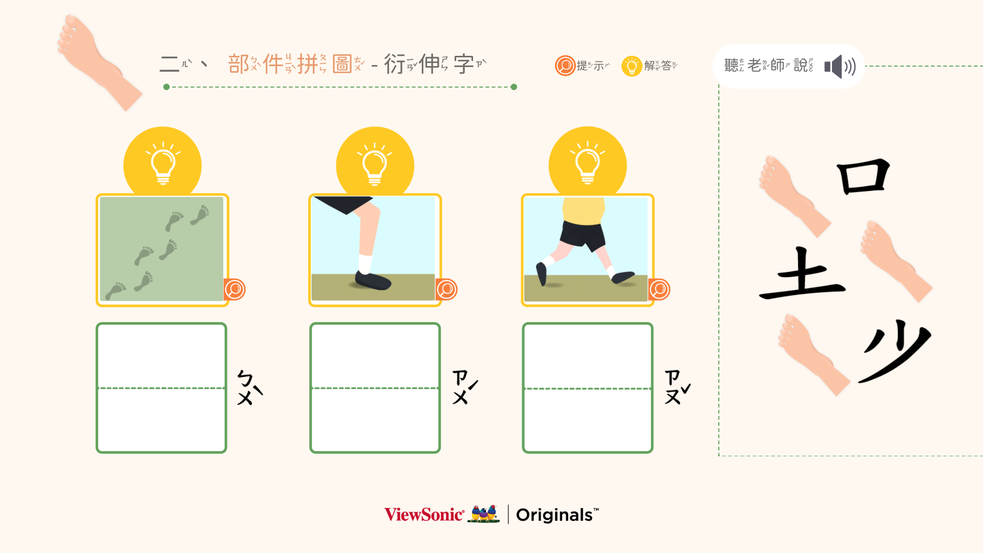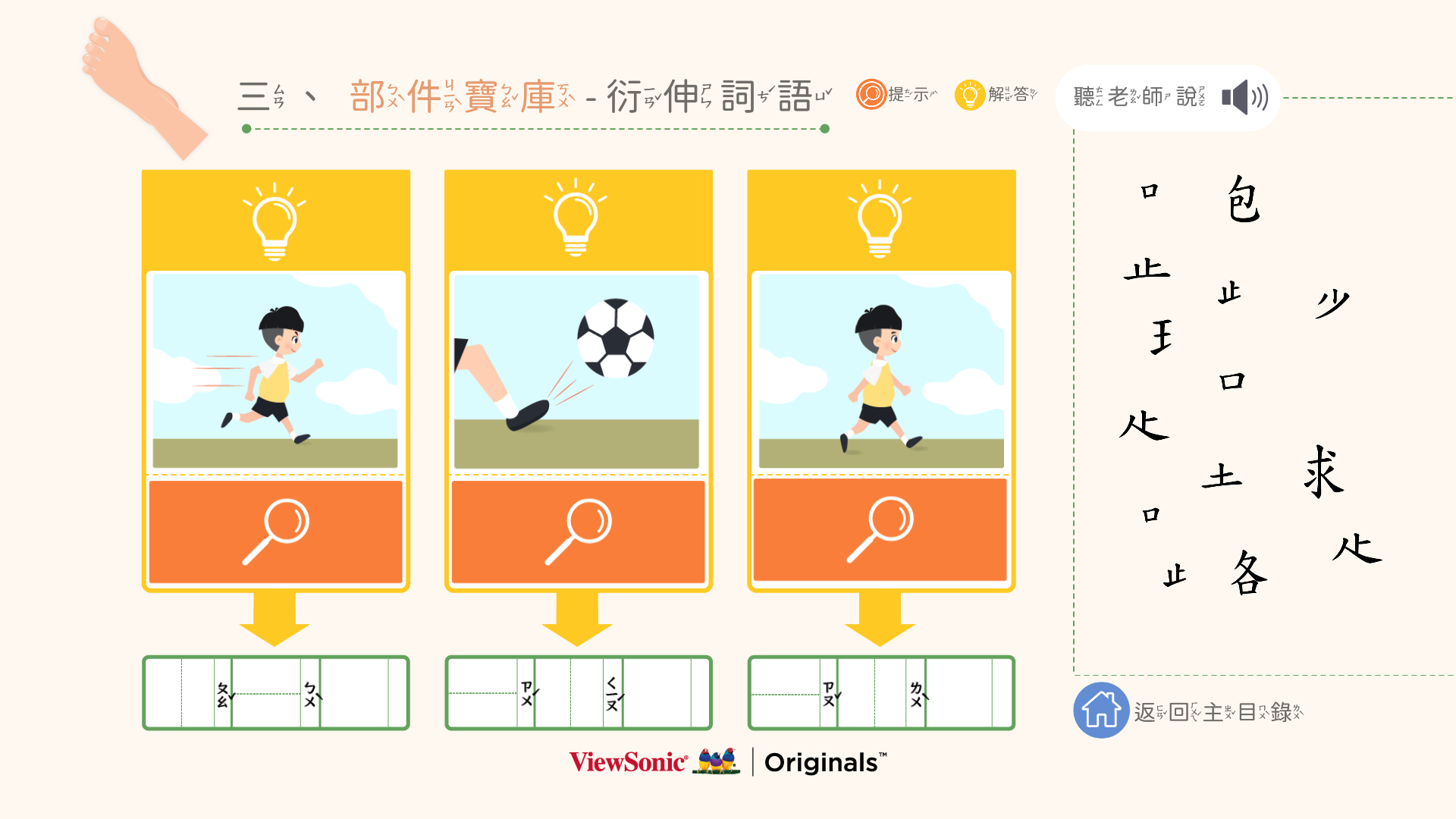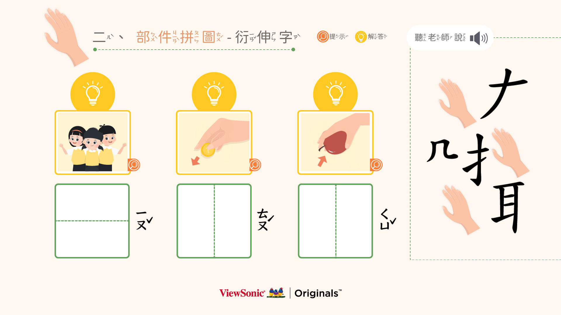 🧩 部件拼圖-衍伸字:透過部件圖卡組合,拼出相關國字,加深對字形結構的認識和概念。