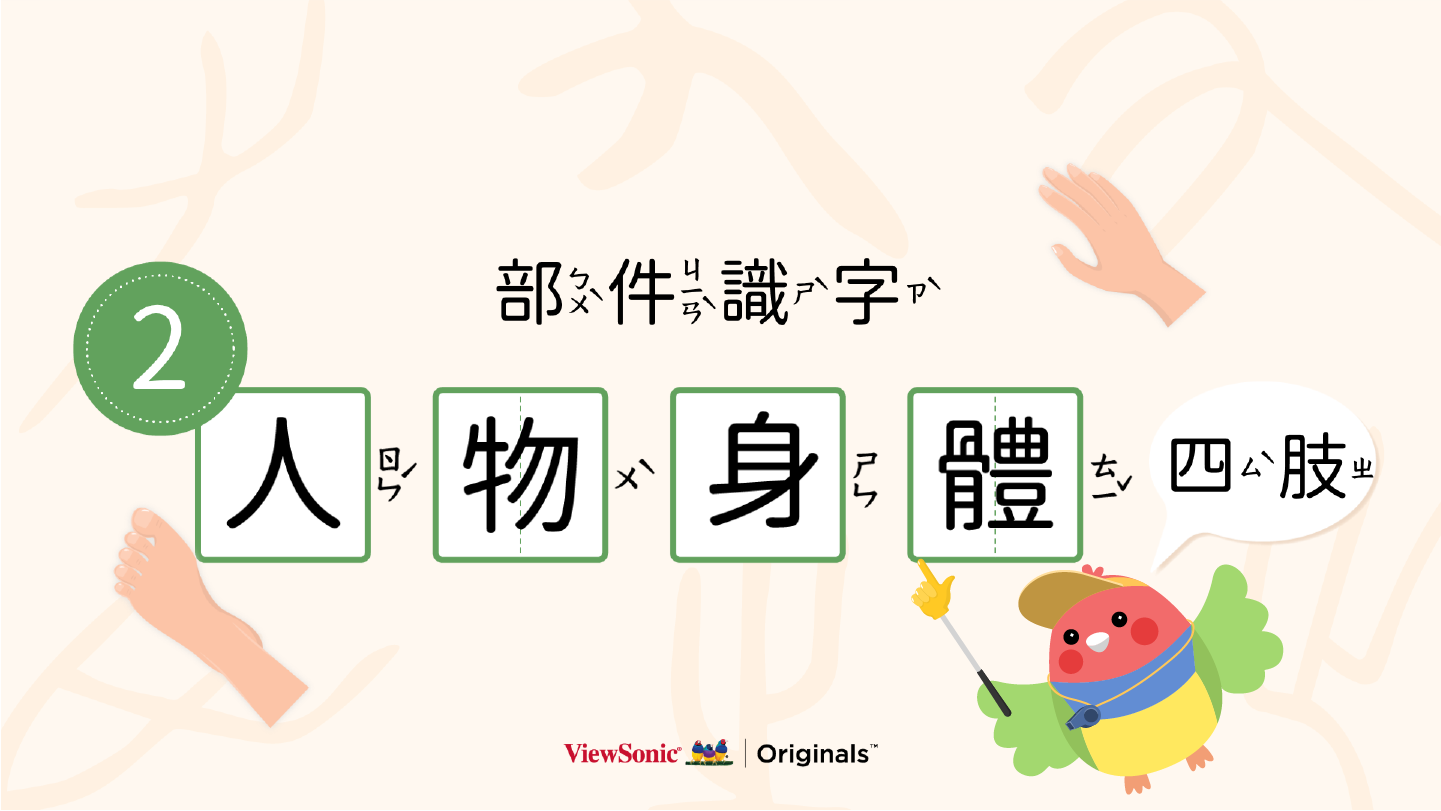以人物為中心的主題課,針對低年級及特教學生,採用「以形表義」的教學方式,讓孩子循著語意路徑來親近中文。以常見部件為本,透過遊戲互動延伸學習相關常見有意義的字,提升識字能力。