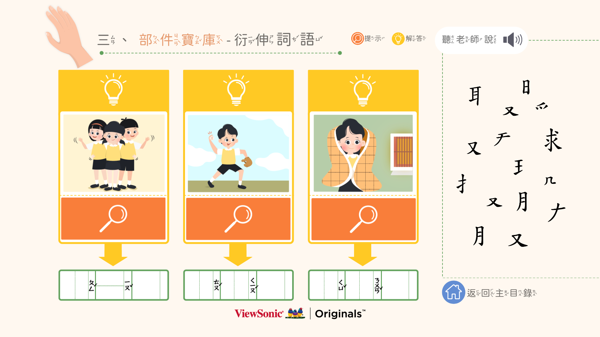 📚 部件寶庫-衍伸詞語:區辨國字中的目標部件,並搭配相關語詞圖片增進理解並擴充識字量。 🎭