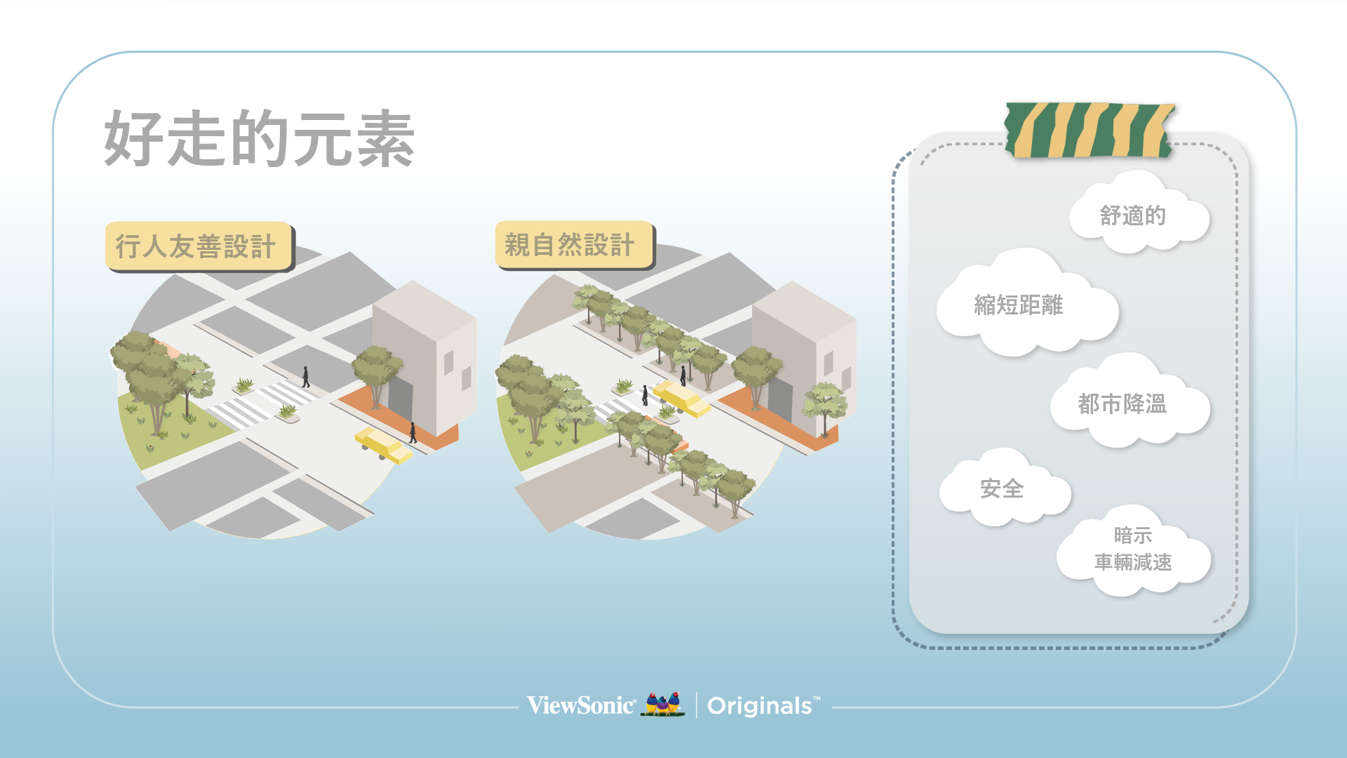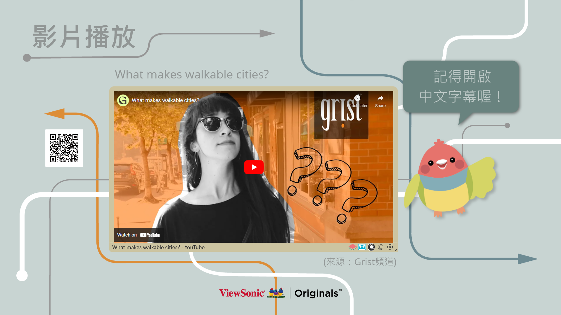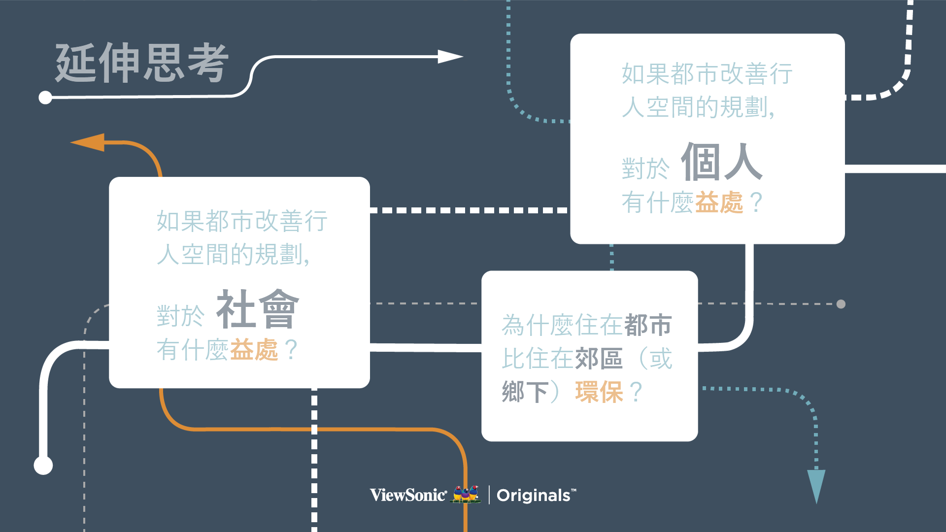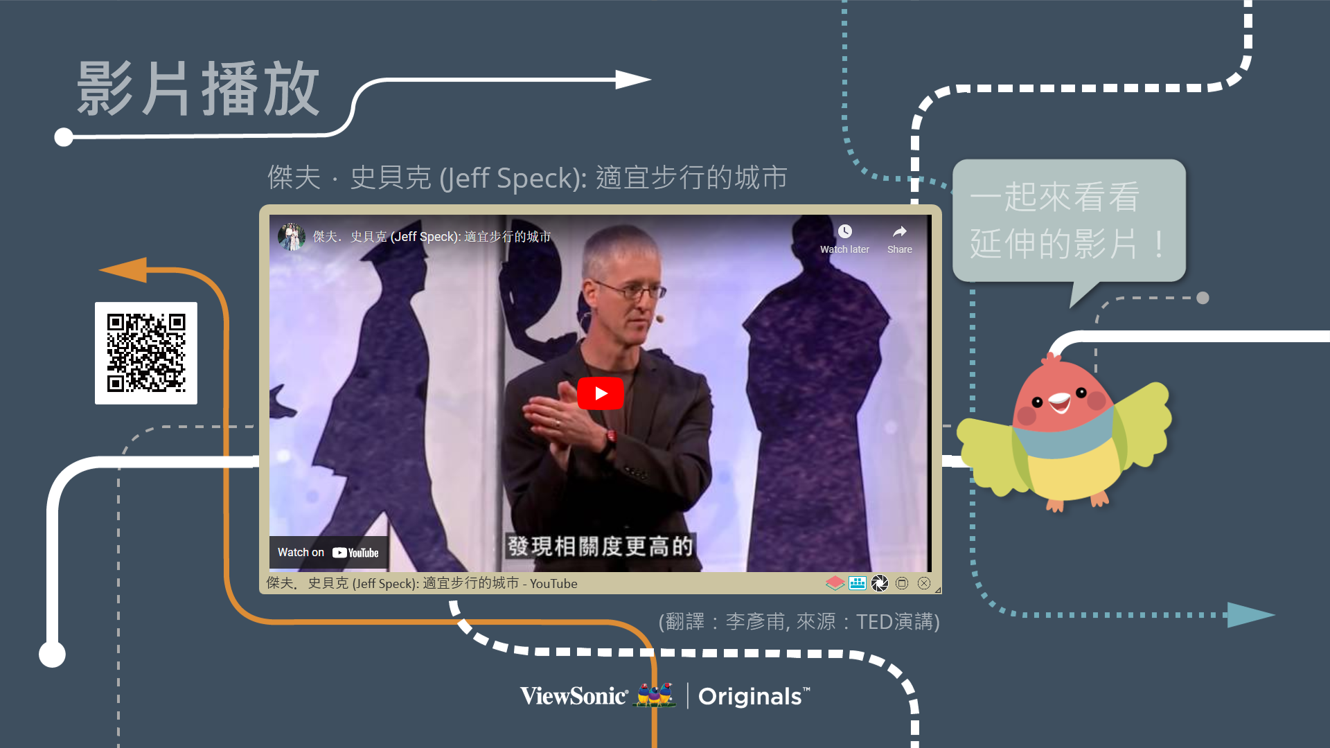 - 影片輔助教學:透過影片中的都市計劃專家傑夫.史貝克(Jeff Speck)說明如何才能免於依賴汽車,讓城市更適合步行,更宜居。